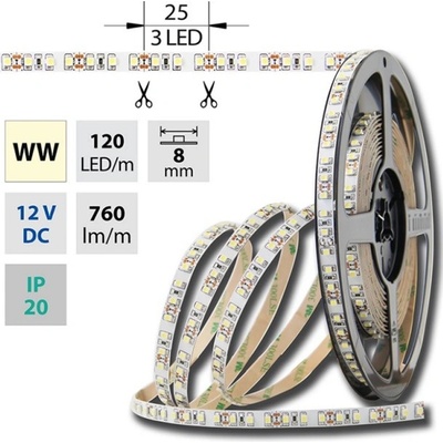 5050WW-M60L10W20F12 LED pásek SMD5050, teplá bílá (3000K), 14,4W, 60LED, 1152lm/m, segment 50mm, 3LED/segment, IP20, DC 12V, životnost 54000h, šíře 10mm, bílý PCB pásek, max....