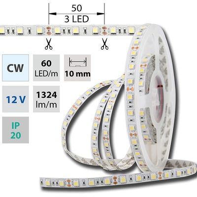 LED pásek SMD5050, neutrálně bílá (4200K), 14,4W, 60LED, 1296lm/m, segment 50mm, 3LED/segment, IP20, DC 12V, životnost 54000h, šíře 10mm, bílý PCB pásek, max. délka pásku při...