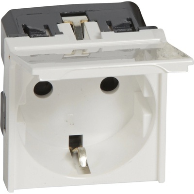 Standardní zásuvka 2P + T řady MOSAIC Pro instalaci do přístrojových krabic, povrchovou montáž, podlahových krabic, montážních sloupků, napájecích bloků a kancelářských bloků. Zapojení bezšroubovými svorkami. Vybaveny clonkami pro dětskou ochranu. Barva: bílá