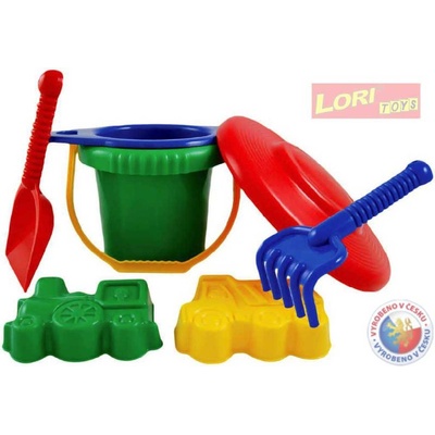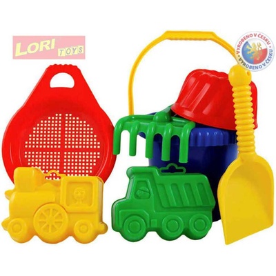 Sada napísek od firmy LORI. Obsahuje: - kbelík - rýč - lopatku - hrabíčka - sítko - 2x bábovky