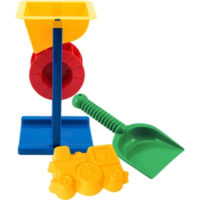 Barevný set z plastu pro děti s mlýnkem, lopatkou a bábovkou - mašinka. Hurá na pískoviště! Aby na něm byla dobrá zábava, nesmí tam chybět hračky na písek, které patří...