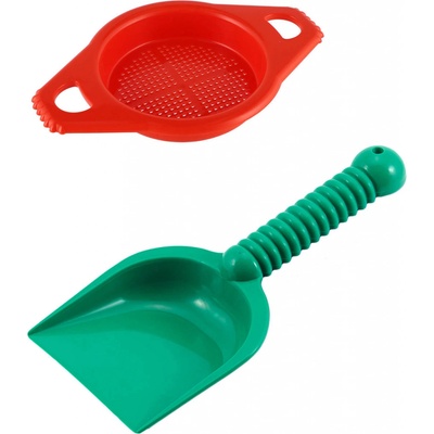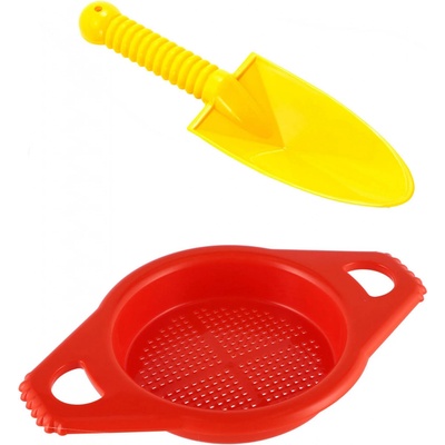 Barevný dětský set z plastu pro děti na písek, obsahující sítko na prosívání písku a lopatku, v různých barevných kombinacích. Hurá na pískoviště! Aby na něm byla dobrá...