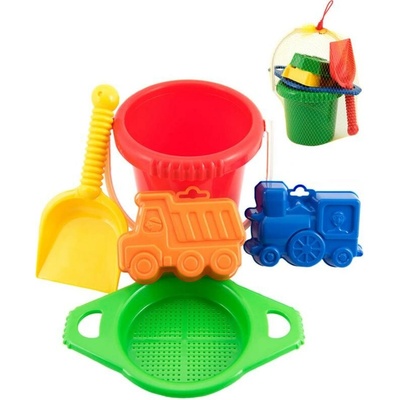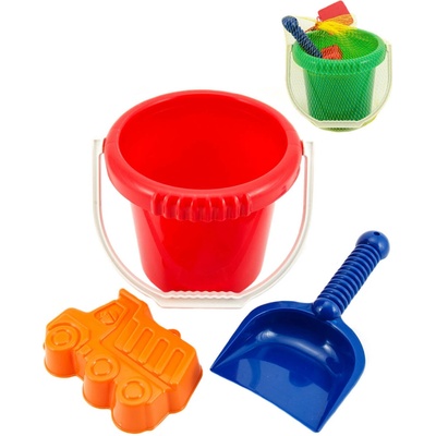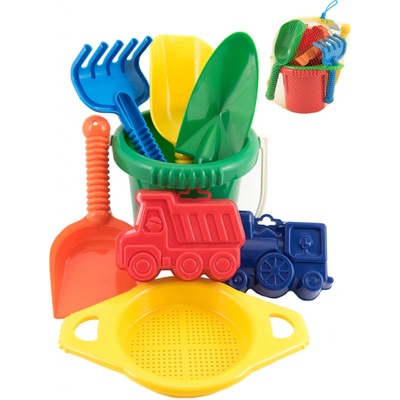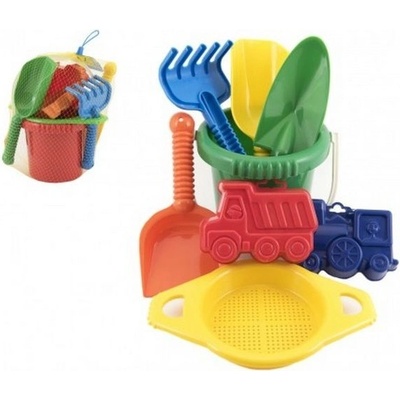 Plastová sada na písek. Sada obsahuje kbelík, sítko, lopatky, hrabičky a 2 bábovky. V síťce 20x28x12 cm. Vhodné od 12 měsíců.