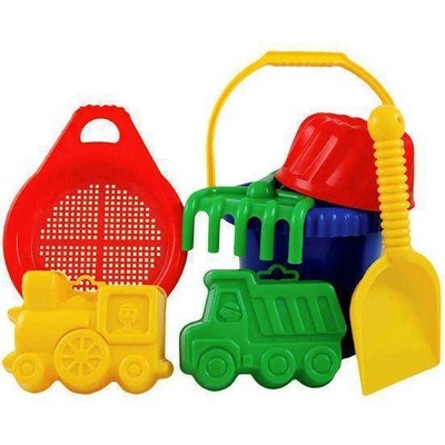 Plastová dětská sada pro děti na písek - kyblíček, sítko, lopatičky, hrábě a dvě formičky - bábovičky (nákladní auto + lokomotiva) Hurá na pískoviště! Aby na něm byla dobrá...