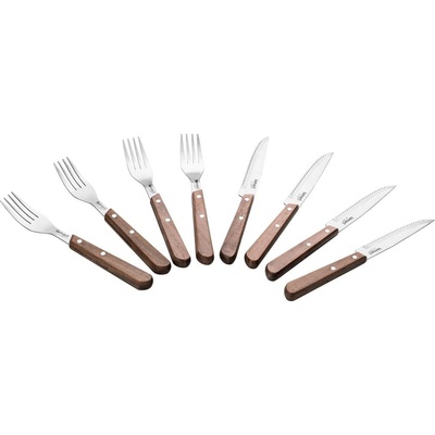 SADA STEAKOVÝCH PŘÍBORŮ 8KS WALNUT. Steakové příbory vyrobeny z velmi kvalitní oceli s ergonomickou rukojetí z ořechového dřeva. Po použití výrobek vždy omyjte a utřete do sucha. Lze mýt v myčce na nádobí. Rozměry: délka nože - 21 cm, délka vidličky - 19 cm.