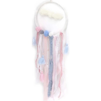 Ručně vyráběný lapač snů s obláčky, stužkami, peříčky a bambulkami, vhodný jako dekorace do dětského pokoje.