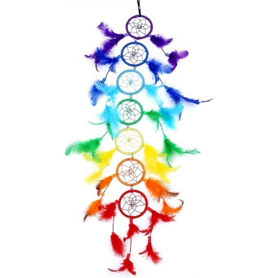 Dekorativní lapač snů v barvách čaker. Lapač je ozdoben pravými pery a sedmi vypletenými kruhy. Jednotlivé kruhy jsou ozdobeny pery ve stejné barvě.
