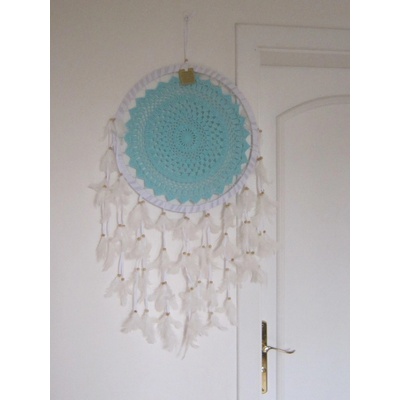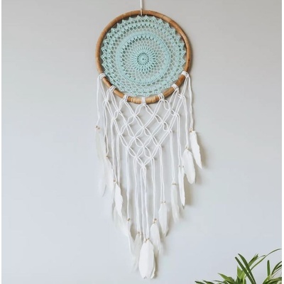 Lapač snů v kruhovém tvaru ze dřeva s mintovým dekorem. Délka: 105cm.