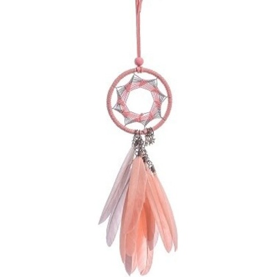 Dekorativní lapač snů s vypleteným kruhem. Lapač je ozdoben perličkami a pravými pery v ružové barvě.