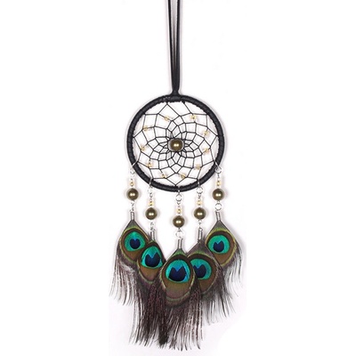Dekorativní lapač snů s vypleteným kruhem. Lapač je ozdoben pravými pavími pery.