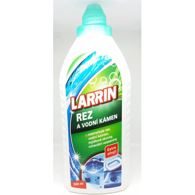 Larrin rez a vodní kámen 500ml. Extra silný prípravek na rez a vodní kámen, pro případy kde bežné prípravky selhávají, snadno a do hloubky vycistí i dlouhodobe usazené necistoty, vhodný na: keramické i nerez drezy, umyvadla, WC, dlaždice, obklady, nerezové vodovodní...