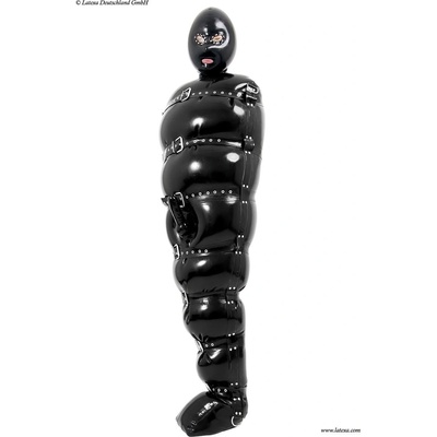 Latexový spací vak, v základní podobě: S předním dlouhým zipem, který začíná vpředu na krku, probíhá středem těla a končí asi v polovině stehen + anální zip. S vnitřními rukávy (jako na produktových obrázcích), pro dokonalou fixaci paží k tělu. Bez hlavové masky,...