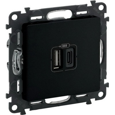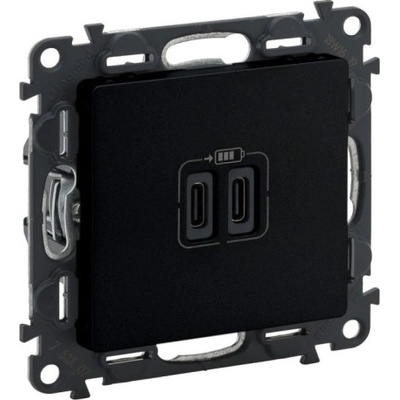 Legrand 756306 dvojitá USB A+C nabíječka v černé barvě ve stylu Valena Life. Upevnění pomocí šroubů. Obsahuje šroubové svorky.