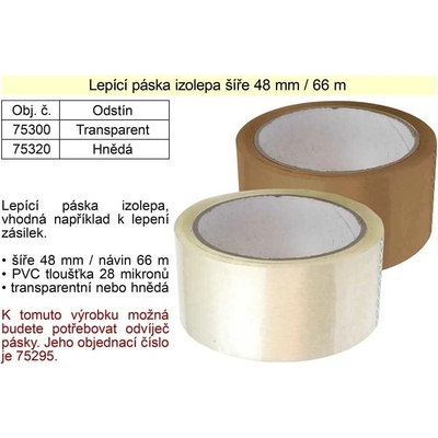 Transparentní lepicí páska v šířce 48 mm a návinu 66 m je vyrobena pro spolehlivé zalepení a zabezpečení chlopní kartonů a fixaci zboží ve výrobnách, velkoobchodech, prodejnách, zásilkových službách apod. Je vhodná pro ruční i strojní lepení, odolná proti UV záření....