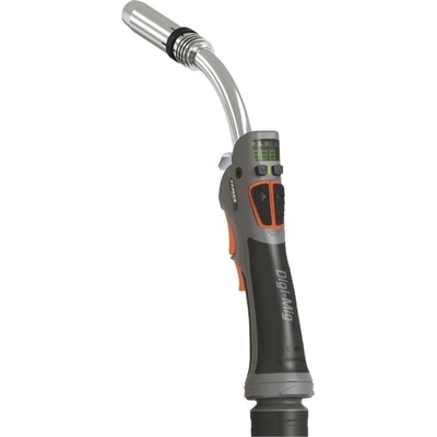 Plynem chlazený svařovací hořák MIG/MAG s dálkovým ovládáním. Pro synergické svářečky Alfa In. Zatěžovatel 60 %. Zatížení 320 A (CO2), 290 A (směs). Pevné hrdlo. EURO přípojka....