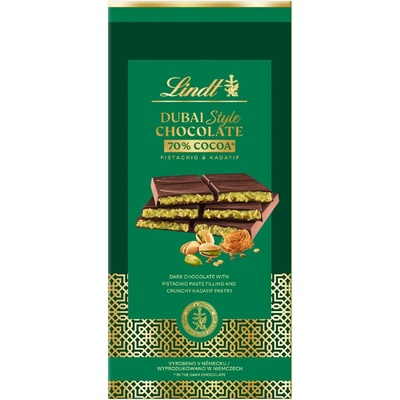 Lindt Dubajská čokoláda hořká 145 g Zažijte luxusní chuť Dubaje s čokoládou od Lindt. Tato prémiová hořká čokoláda v sobě snoubí lahodný krém z pistácií a jedinečnou křupavost...