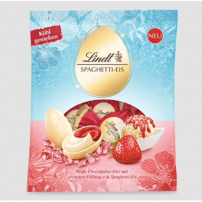Spaghetti-Eis-Eier Beutel, 90g Vejce z bílé čokolády se smetanovou náplní a la špagetová zmrzlina! Plněná bílá čokoláda s jahodovou omáčkou (15 %) na bílém smetaně (26 %)...