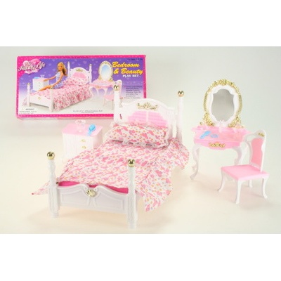 Ložnice obsahuje: plastovou postel o rozměrech cca 16 cm X 34 cm X 18 cm s přehozem přes postel a polštářkem kosmetický stolek o rozměrech cca 13 cm X 8 cm X 22 cm s doplňky...