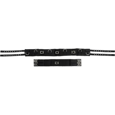 Lonžovací obřišník z bavlny s koženými polštáři na hřbetě. Nerezové kroužky pro upnutí pomocných otěží. Dva kroužky na každé straně a jeden prostřední kroužek, Barva černá ...
