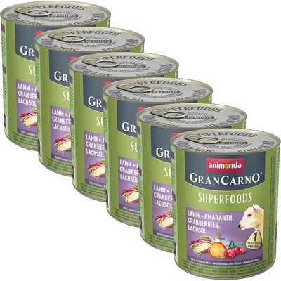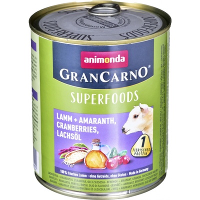 GRANCARNO Superfoods jehněčí,amarant,brusinky,los.olej 800 g pro psy Jehněčí krmivo doplněné o tzv. superpotraviny - to je nová masová konzerva pro psy Animonda Grancarno...