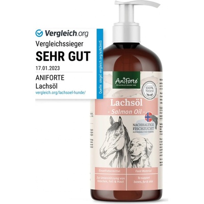Omega 3 lososový olej pro psy, kočky a koně - podporuje metabolismus, kosti, kůži a lesklou srst Lososový olej - přísun esenciálních mastných kyselin Cenné omega-3 mastné...