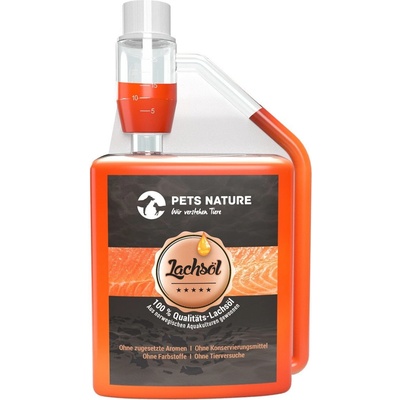 Čistý lososový olej značky Pets Nature v praktické lahvičce s integrovanou odměrkou, vyrobený v Norsku.