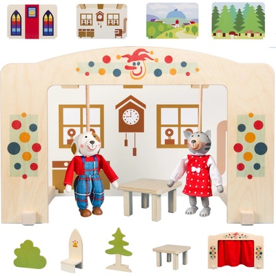 Jsem dostatečně velké, dřevěné a pevné V balení mám 4 pěkné kulisy a 4 pohádkové scény a 5 loutek bez nití Jsem ideální pro desítky loutek z naší dílny Pohádku O...