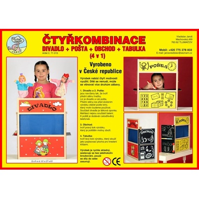 Dřevěné hračky Jaroš Dřevěná čtyřkombinace Originální celodřevěná hračka zabaví děti hned čtyřikrát. Při hraní na divadlo, poštu, obchod nebo si mohou malovat na tabuli...