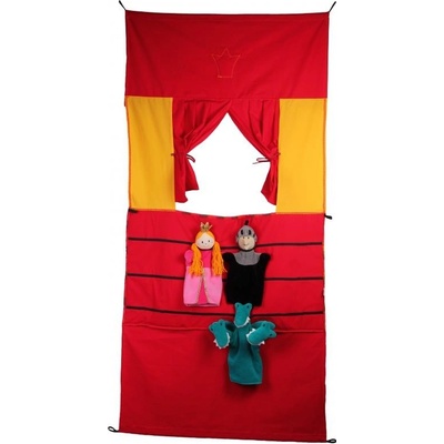 Kvalitní látkové divadlo zavěšené na dřevěné tyčce se shrnovací oponou. Na zadní straně jsou gumové úchyty na loutky. Další 2 dřevěné tyčky plochu vyrovnávají a stabilizují....