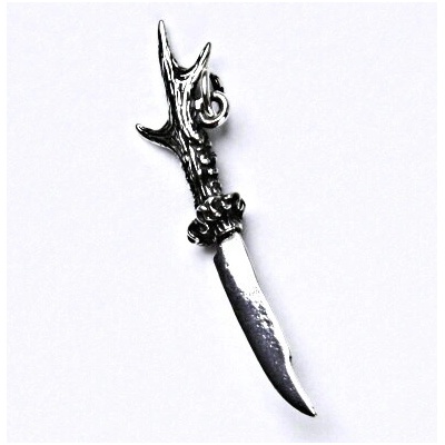 Stříbrný přívěšek s patinou ve tvaru loveckého nože. Velikost stříbrného přívěšku je 39 mm. Materiál je stříbro 925/1000. Orientační váha přívěsku je 1,35 g.