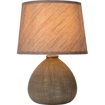 Interiérové stolní svítidlo z keramiky v hnědé barvě, hnědé textilní stínítko.