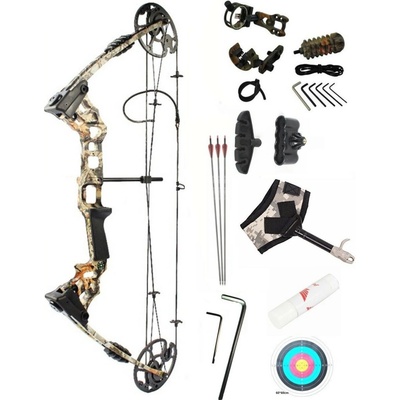 Nastavitelný pravoruký kladkový luk Dreamer CAMO. Nátah 20-70 lbs. Rychlost vystřeleného šípů 320 fps (351 km/h). 3 ks karbonových šípů, stabilizátor, světlovodný zaměřovač,...