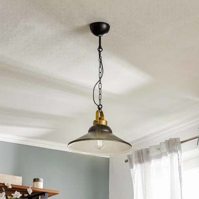 Závěsné svítidlo Vintage Iron je vyrobeno z kovu a skládá se z plochého stínidla natřeného zvenčí černou barvou s bílým vnitřkem, barevně sladěného vrchlíku a řetízkového závěsu. Stínidlo má ozdobný detail ve staromosazném provedení. 1 x E27, max. 60 W (exkluzivně).