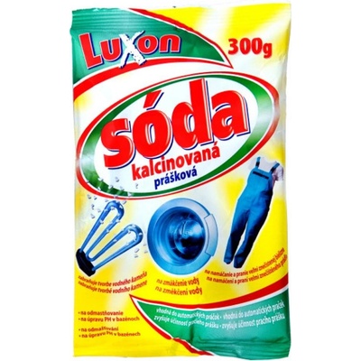 Luxon Soda kalcinovaná 300g. Přípravek na změkčování vody. Na namáčení silně znečištěných oděvů (montérky a jiné) na odmašťování. Zvyšuje účinnost pracího prášku. Zabraňuje usazování vodního kamene. Vhodný na úpravu pH v bazénech.