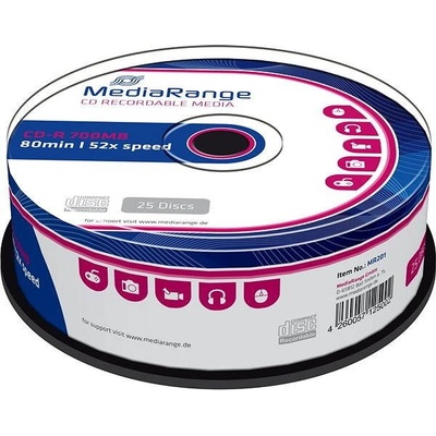 Kvalitní a cenově dostupná média CD-R značky MediaRange. Bílý celoplošný povrch k potištění na inkoustové tiskárně, poskytuje spolehlivý zápis dat s kapacitou až 700 MB při...