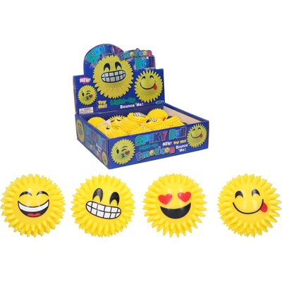 Míček úsměv s bodlimami pískací. Velikost 7 cm. Světelné efekty, baterie nelze měnit. 12 ks display box. 8 variant.