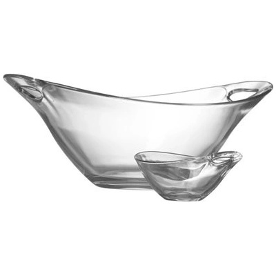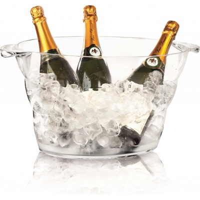 Průhledná, oválná mísa na šampaňské vyrobená z umělé hmoty.