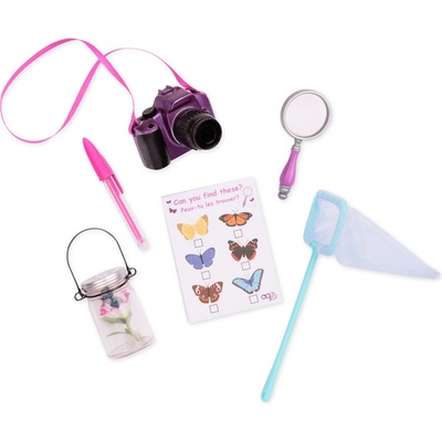 Our Generation – Set poznáváme motýly je vhodný pro panenky velikosti 46 cm. Součástí balení je síť na motýly, lupa, zavírací sklenice, bloček s motýly, pero a fotoaparát....