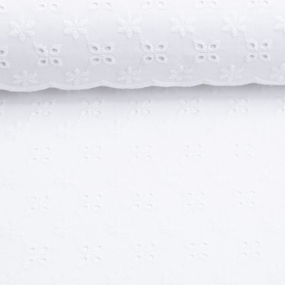 Bavlněná látka (šatovka) MADEIRA v bílé barvě s vyšívanými vzorečkem. Látka je vhodná na výrobu šatů, sukní, halenek, košilí, košilových šatů . Látka je v šířce 135 cm, vyrobena ze 100% bavlny (100g/m). Látka je z obou stran stejná.