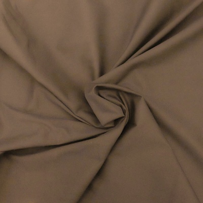 Elastický úplet (jersey) v jednobarevné mocca (kávové) barvě s vyšívanými proužky, který je vhodný na trička, mikiny, elasťáky, šaty, sukně, kardigany. Látka je v šířce 170 cm, vyrobena z 97% bavlny a 3% elastanu (gramáž 170g/m2). Látka je oboustranná.