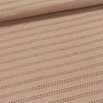 Elastický úplet (jersey) v jednobarevné mocca (kávové) barvě s vyšívanými proužky, který je vhodný na trička, mikiny, elasťáky, šaty, sukně, kardigany. Látka je v šířce 170 cm,...