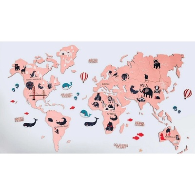 Mapa světa pro děti dřevěná 2D na stěnu - RŮŽOVÁ 150x90cm. Detska mapa světa je dokonalým doplňkem do dětského pokoje.