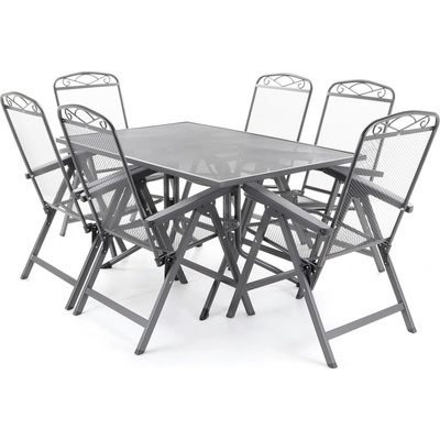 Stolová sestava se skládá z: 6x kovové polohovatelné Křeslo ZINGST II. Rozměry: 105 x 65 x 60 cm Hmotnost: 7,3 kg 1x kovový stůl MEC-MESH 140 Rozměry: 140 x 90 x 71 cm Hmotnost: 22 kg Výplet s oky s vysokou pevností. Speciální 4-vrstvá povrchová úprava s NANO...