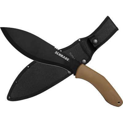 Kompaktní mačeta Schrade 1121080, tvar kukri, černěná čepel, protiskluzová gumová rukojeť s otvorem na závěsnou šňůru, nylonové pouzdro.
