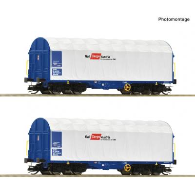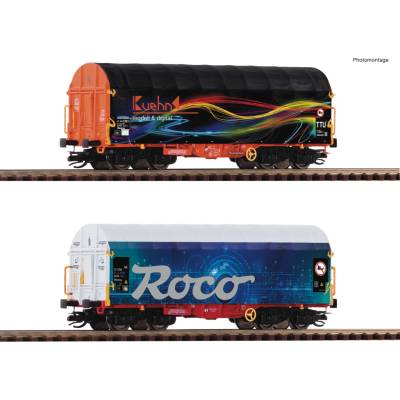 Vagóny s posuvnou plachtou, v reklamním designu ROCO a Kuehn Množství: 2 ks Dopravce: PRIVAT Epocha: VI Délka: 200 mm Modelová velikost: TT (1:120) Novinka roku...