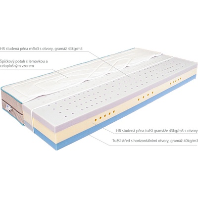 Velmi pohodlná matrace se sedmizónovým děrováním jádra. Matraci lze otočit na měkčí, či tvrdší stranu. Vertikální otvory odvádějí vlhkost a přebytečné teplo mimo matraci. Dvě...