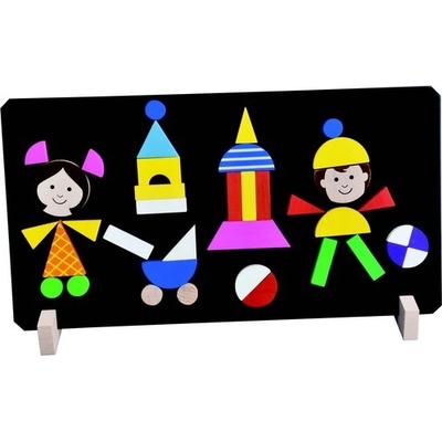 Na oboustrannou tabulku si děti mohou sestavit obrázky dle přiložených předloh nebo své fantazie. Obsahuje: 57 dílků, 10 předloh a tabulku 25 x 25 cm. Vhodné od 3 let.