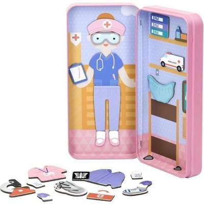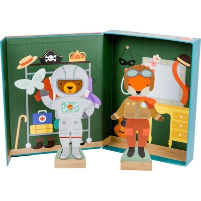 Rozměry balení: 26x26x5 cm Rozměry postavy: 9,5x21,5 cm Věk: 3+ Materiál: dřevo, magnet Obsahuje 36 ks příslušenství