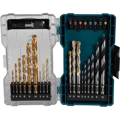 Sada obsahuje vrtáky do kovu 3, 4, 5, 6 a 8 mm, vrtáky do zdiva 4, 5, 6 a 8 mm, vrtáky do dřeva 5, 6 a 8 mm, bity 25 mm PH1, PH2, PZ1, PZ2, PZ3, SL0,5x3, SL0,6x5, SL1x6, H3,...