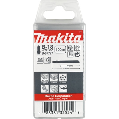 HCS plátky do kmitací pily č. B-18. Ideální pro řez křivek v překližce, dřevotřísce a PVC (2-20 mm), 14 TPI, 100 ks v bal.HCS plátky do kmitací pily č. B-18. Ideální pro řez...